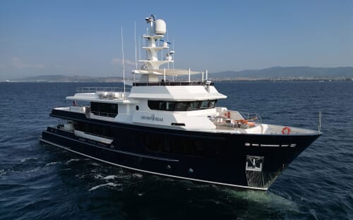 Mit ihrem GFK-Rumpf und -Aufbau ist sie zu beeindruckenden Geschwindigkeiten fähig und bietet dank ihres gleitenden Rumpfes eine hohe Effizienz. Angetrieben von zwei MTU-Motoren erreicht sie eine komfortable Reisegeschwindigkeit von 22 Knoten, eine Höchstgeschwindigkeit von 30 Knoten und eine Reichweite von bis zu 2.300 Seemeilen mit ihren 22.000-Liter-Tanks.