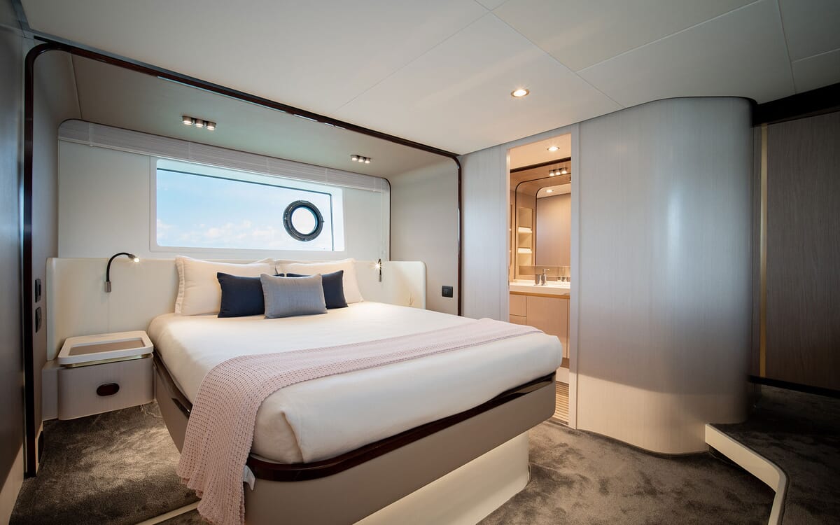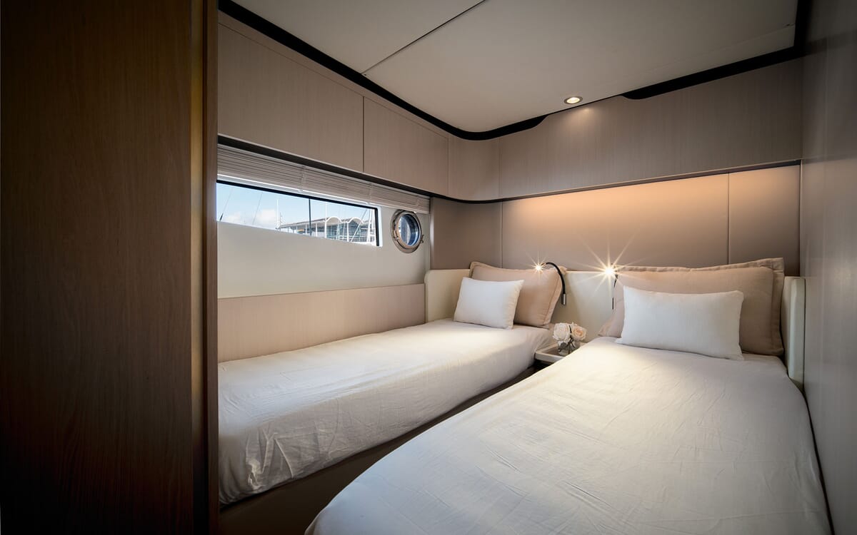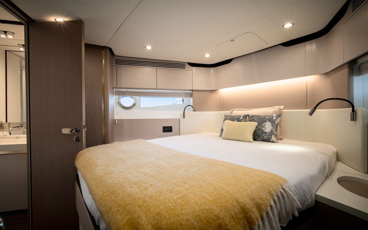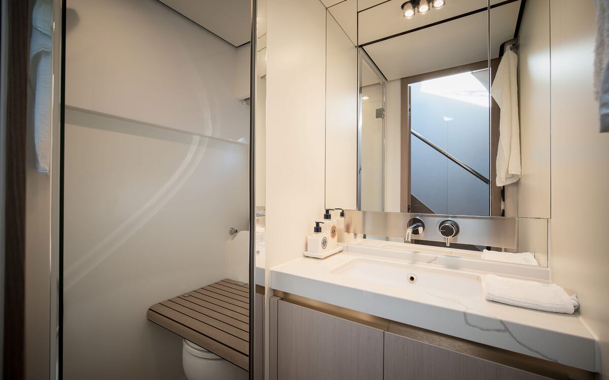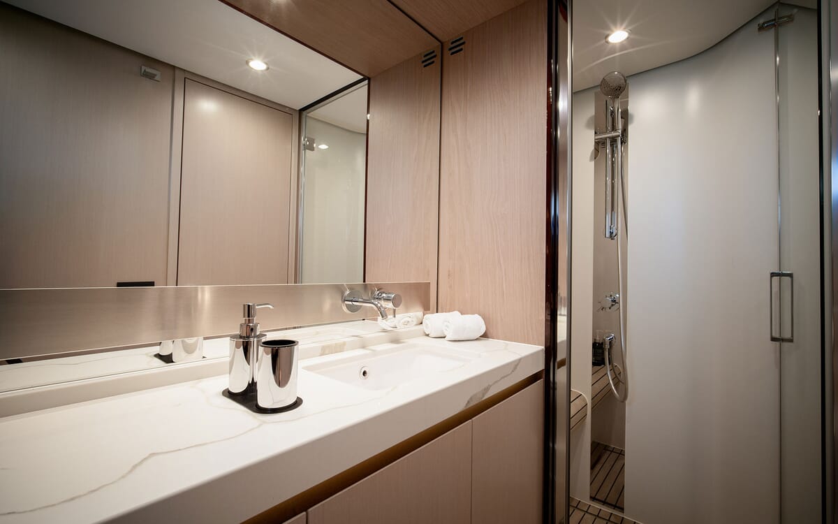 Die Azimut 60 verfügt über ein helles, modernes Interieur von Achille Salvagni, das elegantes italienisches Design mit funktionellem Komfort verbindet. Große Fenster füllen den Salon mit natürlichem Licht und beleuchten die Lounge, den Essbereich und die gut ausgestattete Kombüse. Zu den Unterkünften für sechs Personen gehören eine durchgehende Master-Suite mit eigenem Bad, ein vorderes VIP-Doppelzimmer mit eigenem Bad und eine Gästekabine mit zwei Einzelbetten, die über ein Tageslichtbad und eine Dusche gegenüber verfügen. Hochwertige Oberflächen, edle Hölzer und weiche Einrichtungsgegenstände schaffen eine raffinierte Atmosphäre, während eine separate Crew-Kabine achtern für Privatsphäre sorgt. Stilvoll und geräumig, bietet die Azimut 60 außergewöhnlichen Komfort und Handwerkskunst in allen Bereichen.