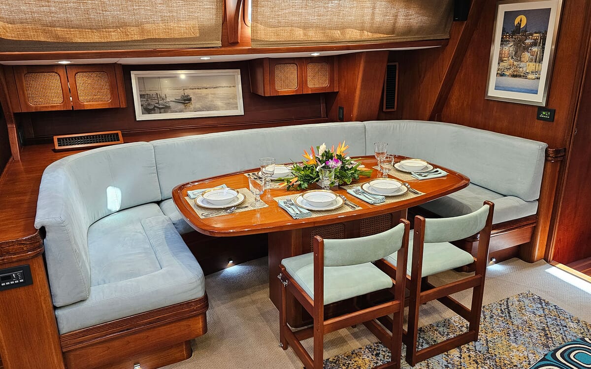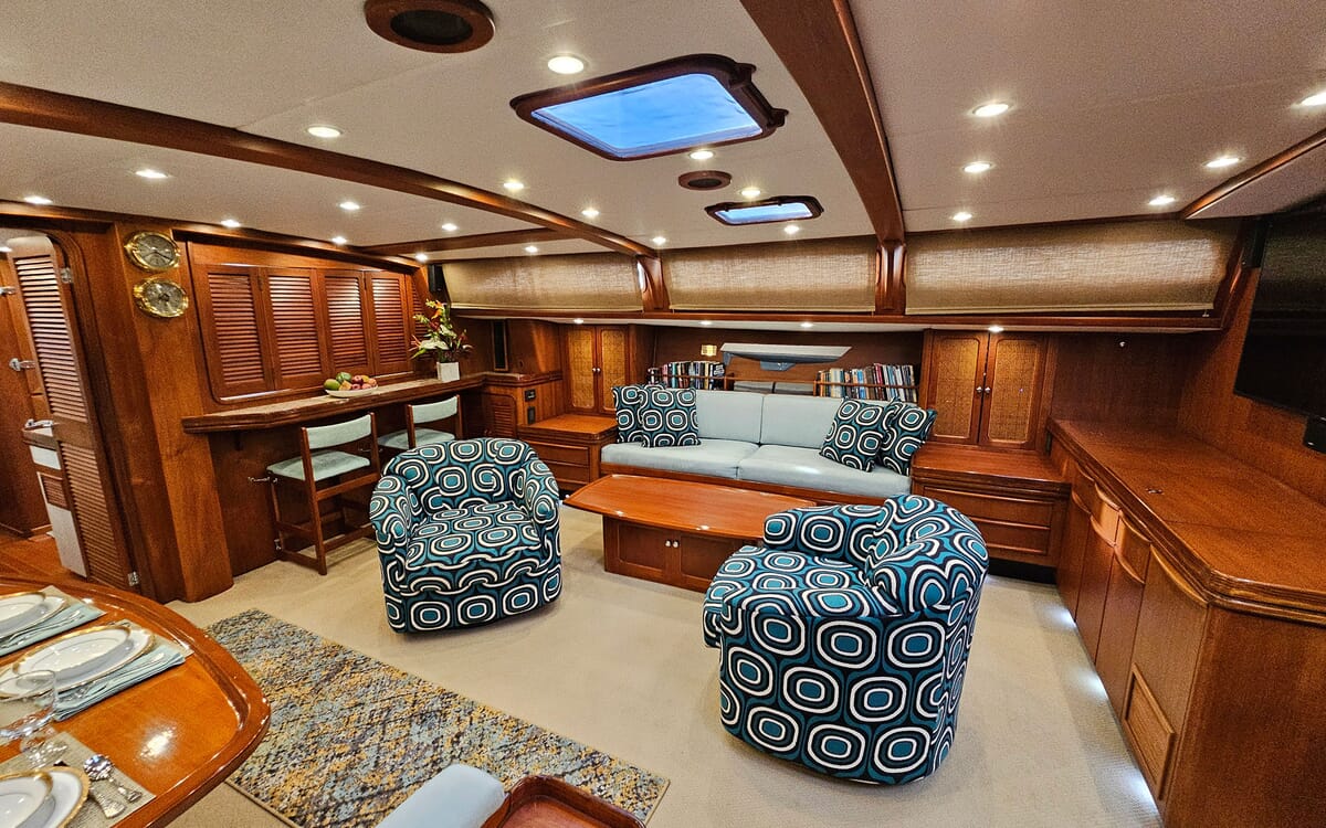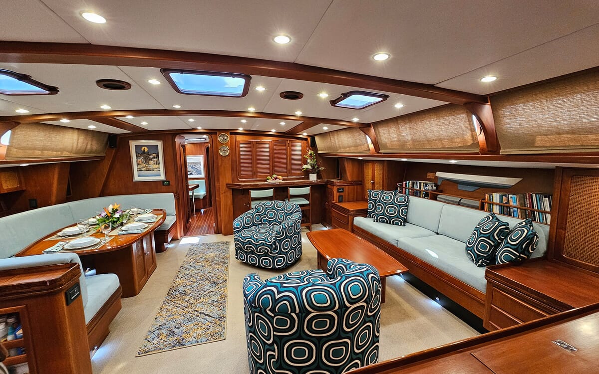 El EAGLE'S NEST ofrece un interior cálido y acogedor con una distribución práctica y atemporal diseñada para un crucero cómodo y estancias prolongadas a bordo. El salón principal es luminoso y acogedor, con amplios asientos y una fácil conexión entre las zonas de descanso y comedor, creando un ambiente relajado y sociable.