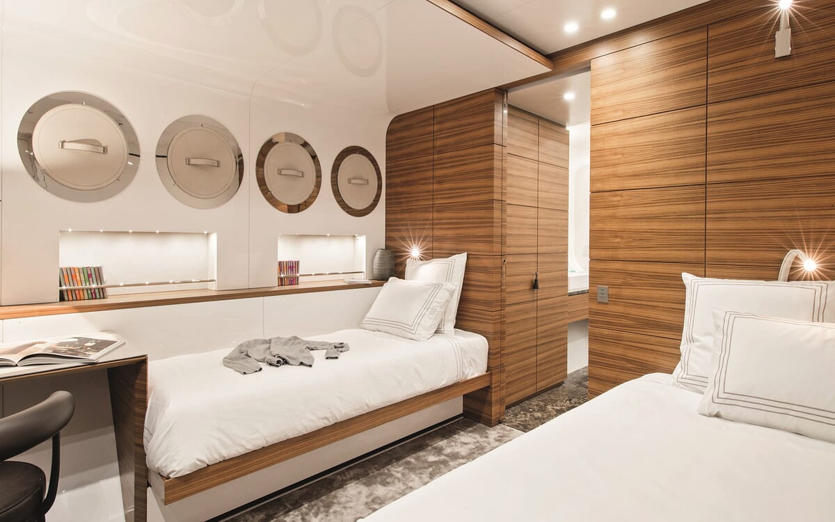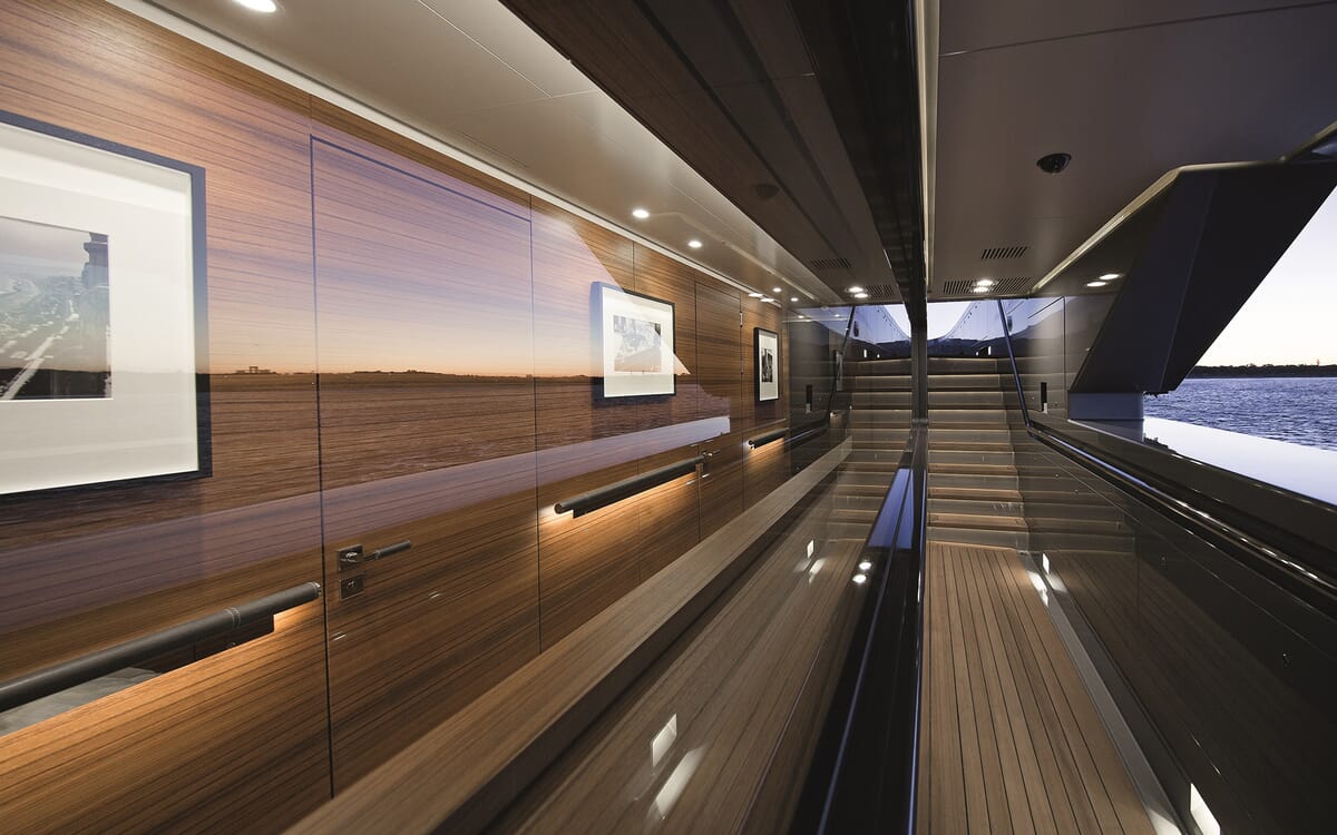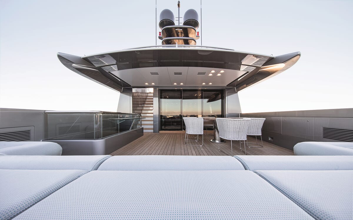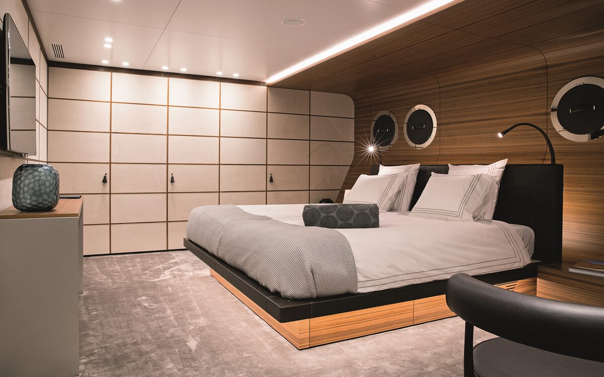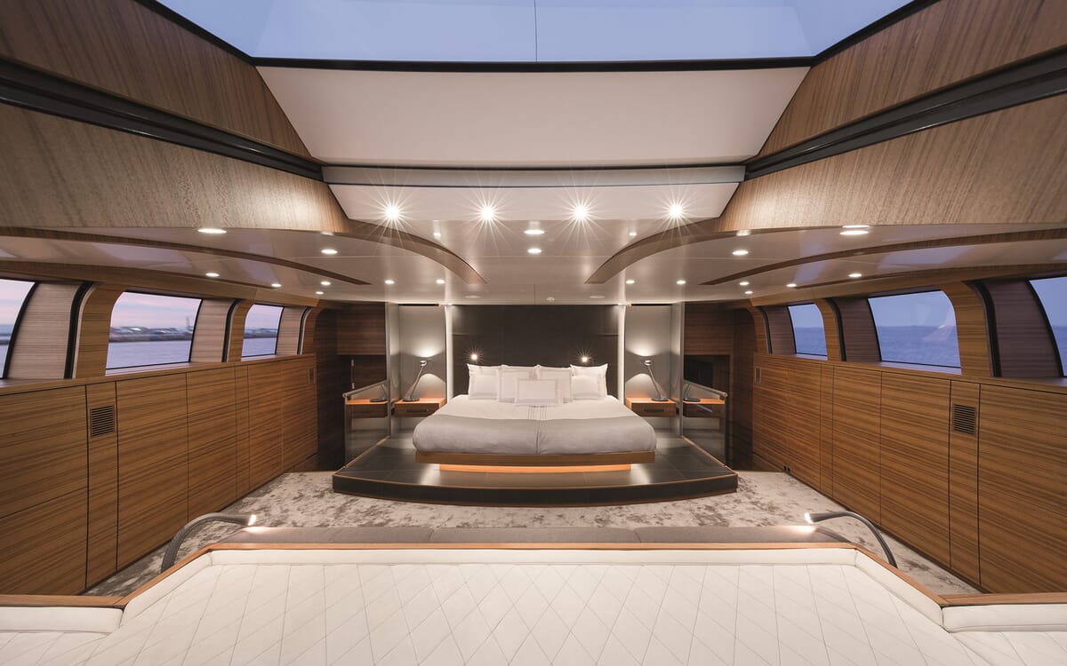 The modern interior is complemented by a range of beautiful furnishings and art, creating spaces that are both welcoming and contemporary. The Owner's living space is spread across a full deck, boasting a spacious lounge leading to a private deck, and a luxurious master stateroom with 180-degree view, his and hers en suite, and a study area.