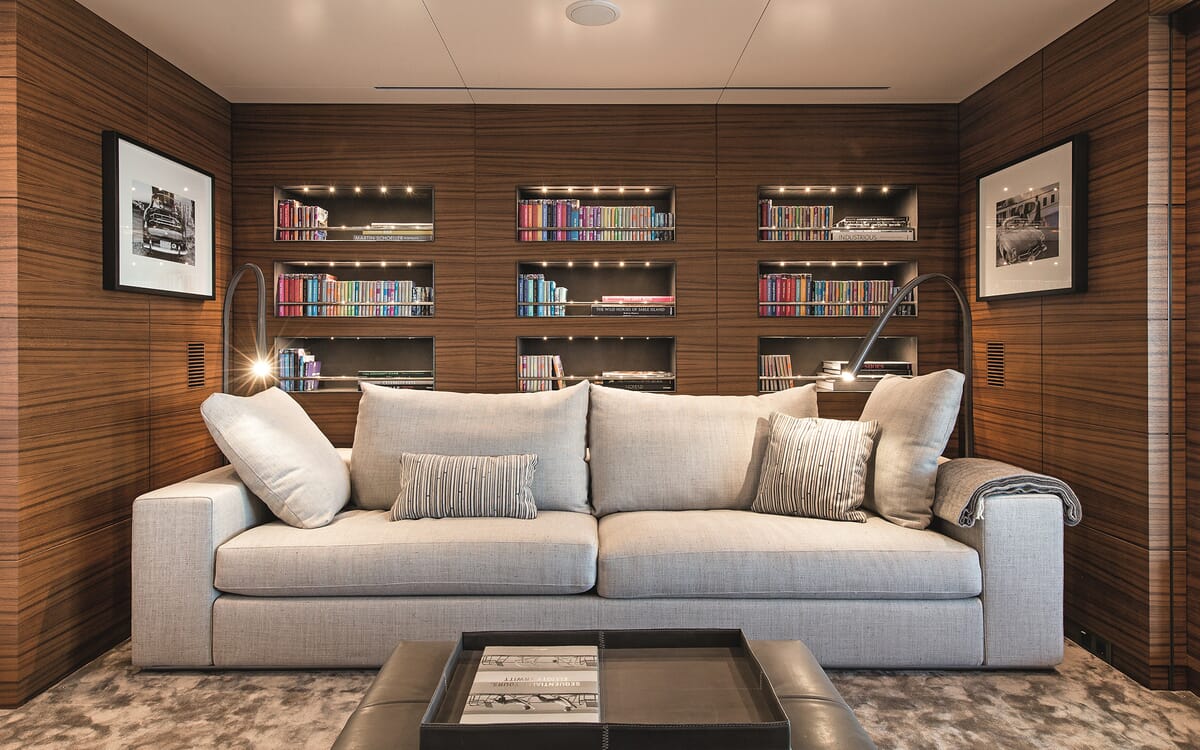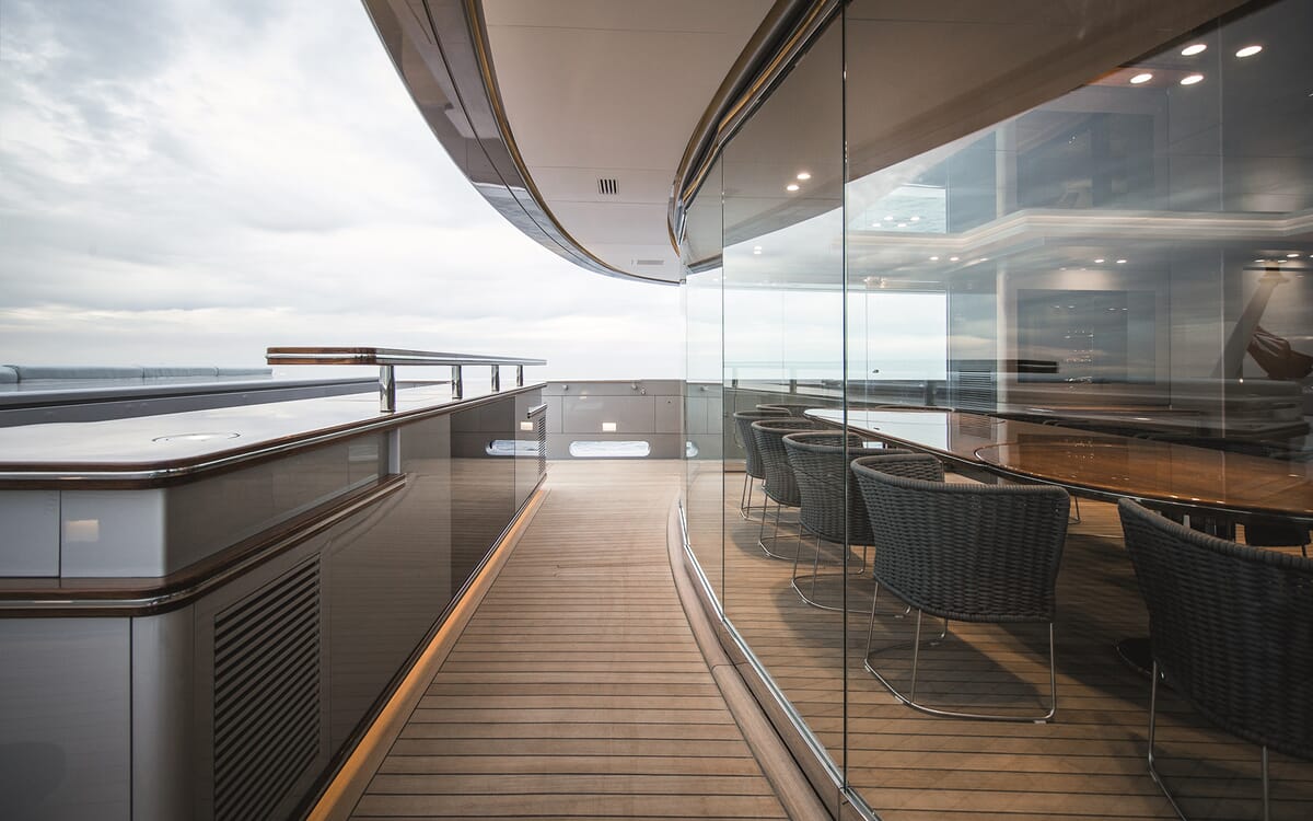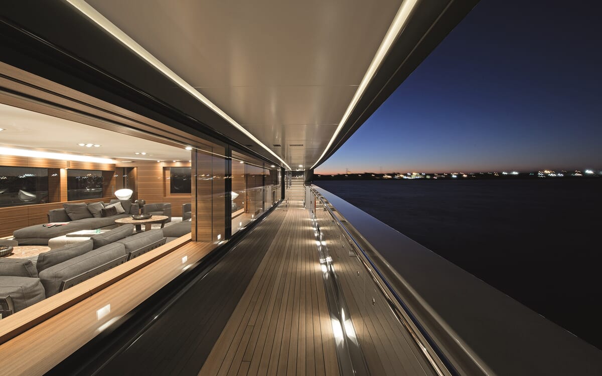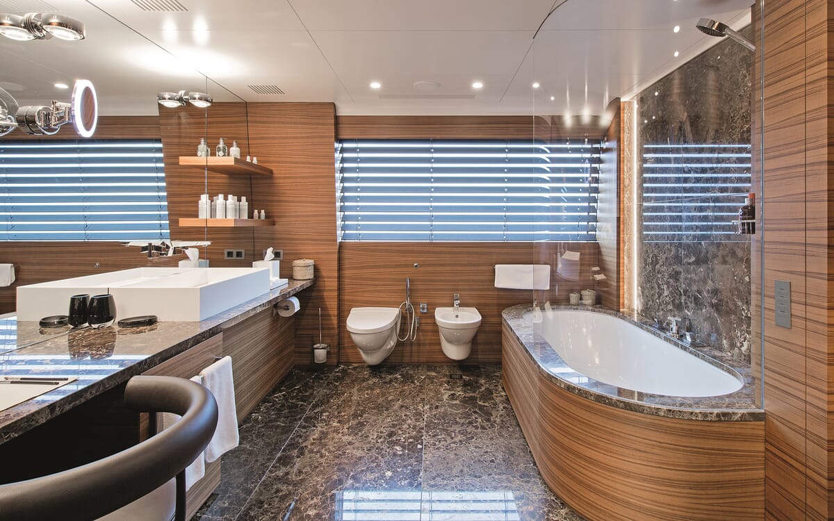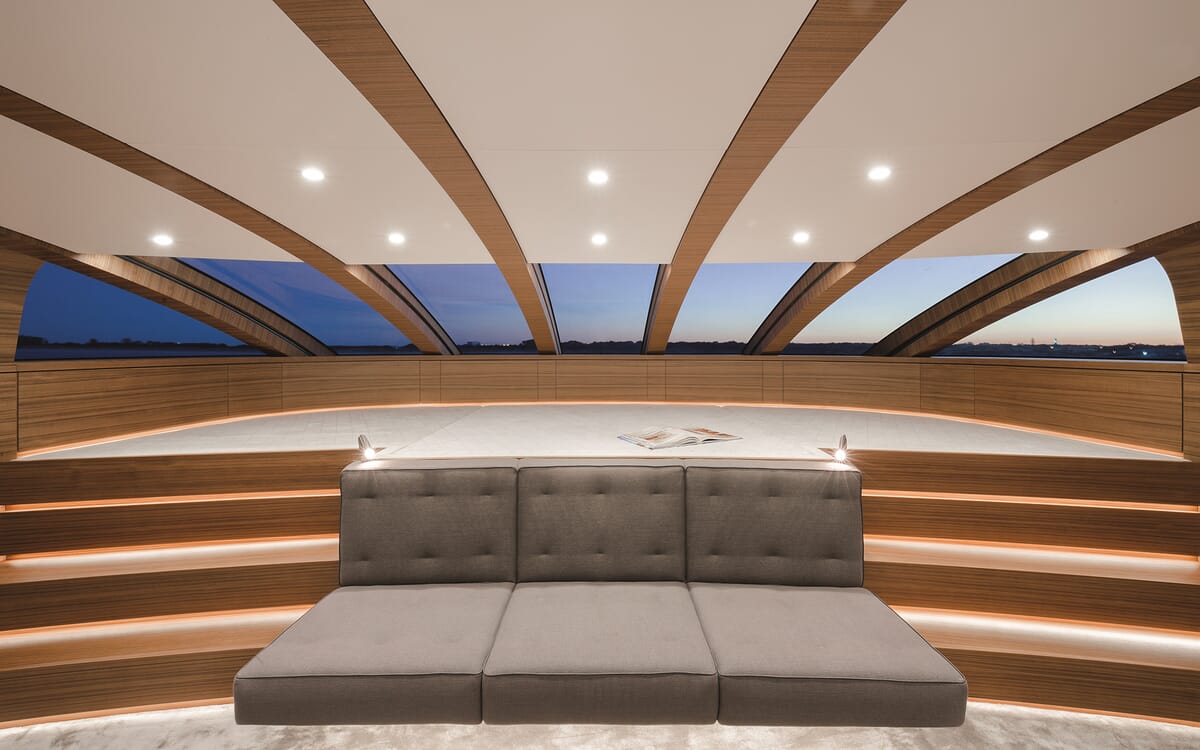 The modern interior is complemented by a range of beautiful furnishings and art, creating spaces that are both welcoming and contemporary. The Owner's living space is spread across a full deck, boasting a spacious lounge leading to a private deck, and a luxurious master stateroom with 180-degree view, his and hers en suite, and a study area.